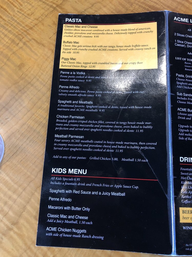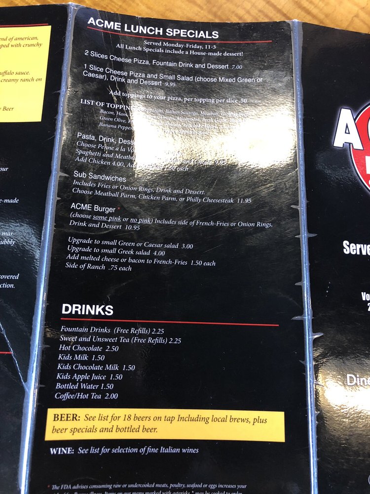 ACME Pizza caters to all dietary preferences with many vegetarian options available. The restaurant is wheelchair accessible, has outdoor seating, and offers delivery and takeout services. The casual atmosphere and friendly staff make dining here a comfortable and enjoyable experience. With options for catering, good for groups, and even happy hour specials, ACME Pizza is a must-visit spot for lunch or dinner. Don't forget to try their beer and wine selection!