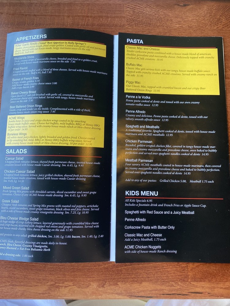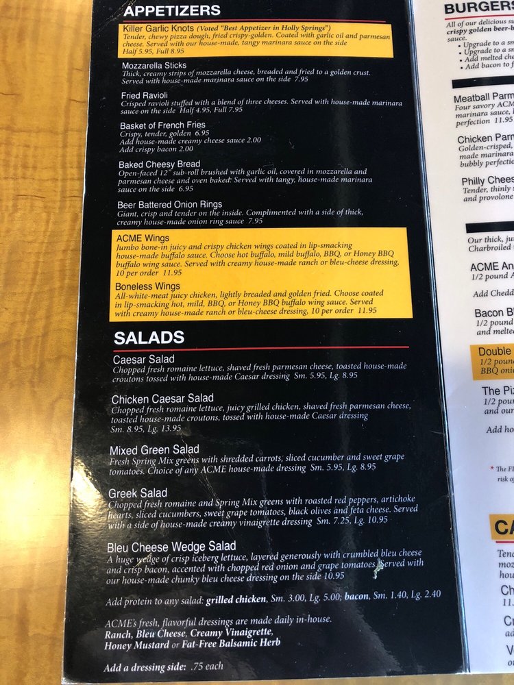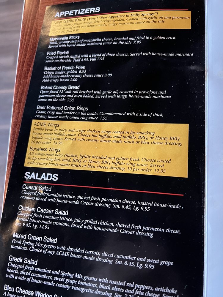 Welcome to ACME Pizza, a haven for pizza lovers and Italian food enthusiasts! Located in Holly Springs, NC, this restaurant offers a variety of delicious options including killer garlic knots, mozzarella sticks, and fried ravioli as appetizers. Their salads, such as the Caesar salad and chicken Caesar salad, are fresh and flavorful.